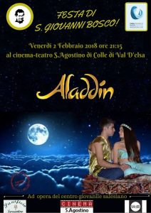 Venerdì 2 febbraio alle ore 21,15 al cinema-teatro Sant’Agostino di Colle di Val d’Elsa in occasione della Festa di San Giovanni Bosco i ragazzi della parrocchia di Sant’Agostino e del centro giovanile salesiano porteranno in scena un musical liberamente tratto da Aladdin ad ingresso libero. è un film d’animazione del 1992 prodotto dai Walt Disney Animation Studios e distribuito dalla Walt Disney Pictures. È considerato il 31° Classico Disneysecondo il canone ufficiale e fa parte dei film dell’era del Rinascimento Disney. Il film è stato diretto da Ron Clements e John Musker ed è basato sul famoso racconto persiano di Aladino e la lampada meravigliosa contenuto nella raccolta Le mille e una notte. Il cast di doppiatori originali è composto da Scott Weinger, Robin Williams, Linda Larkin, Jonathan Freeman, Gilbert Gottfried, Frank Welker e Douglas Seale