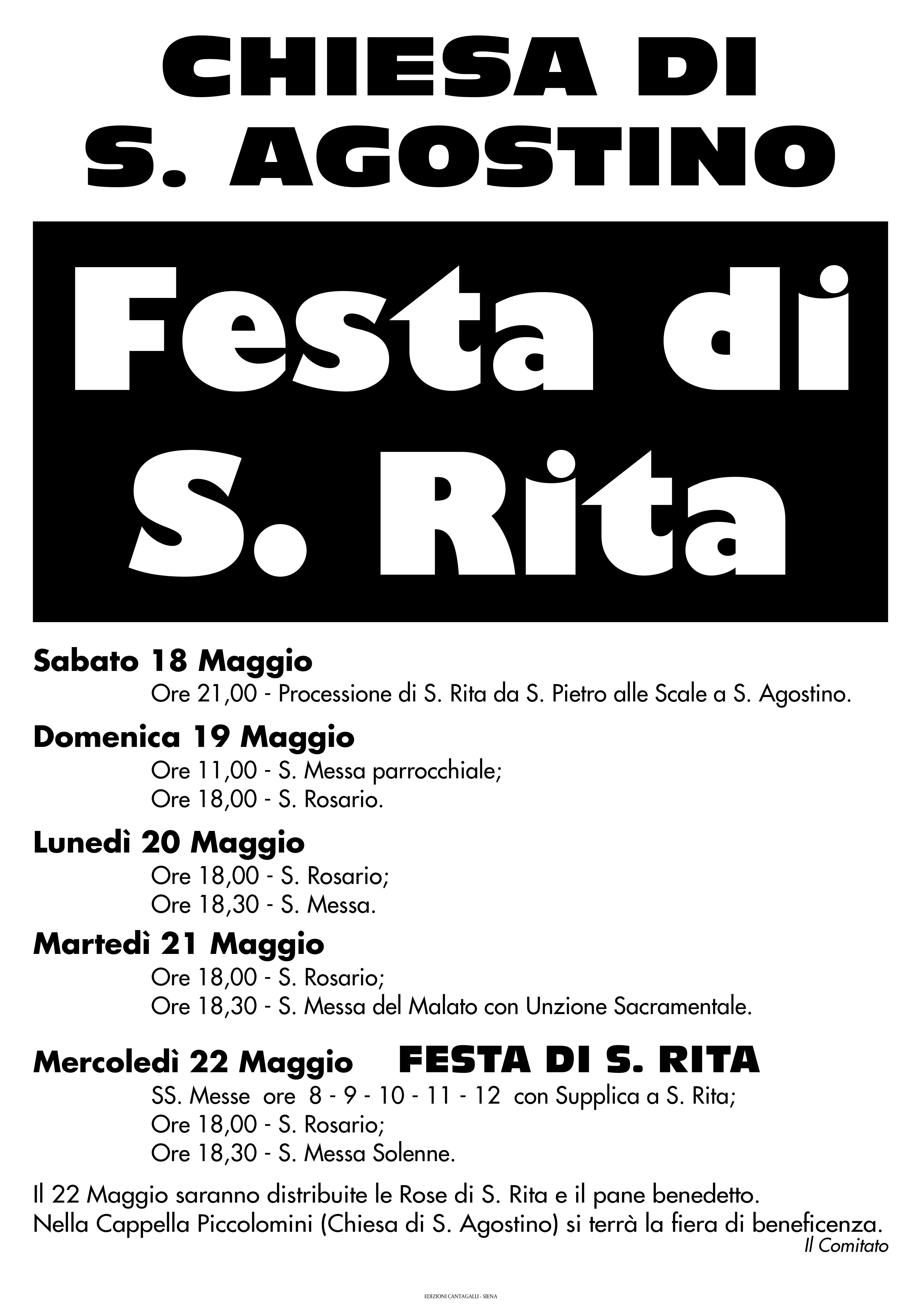 Anche nella nostra Diocesi si rende onore alla grande Santa: a Chiusdino, dove, nella chiesa di San Sebastiano, sede dell’antica Confraternita di San Galgano, si trova la sua statua il 22 maggio è celebrata la S. Messa e sono benedette le rose ed in modo particolare a Siena, dove la statua di Santa Rita, che è collocata nella chiesa di San Pietro alle Scale, viene ogni anno traslata,il 18 maggio, in S. Agostino- sua ubicazione di molti anni fa, quando esisteva il Convento degli agostiniani- ed è esposta alla venerazione dei fedeli. Qui i Confratelli e le Consorelle delle Compagnie Laicali si sono recati per sostare in preghiera comunitaria sabato 18, alle ore 21.