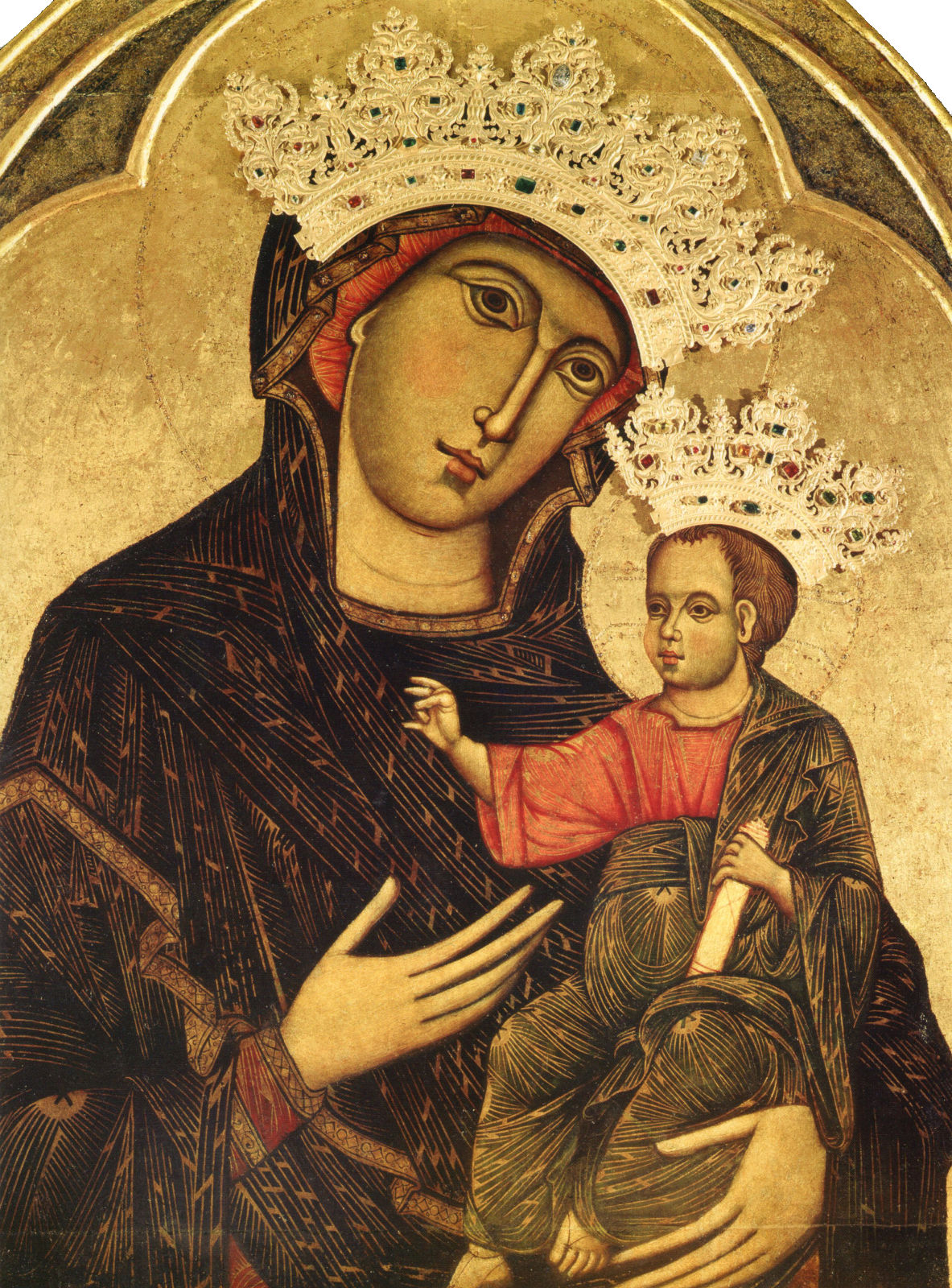 La Madonna con il braccio sinistro abbraccia il Bambino esprimendo un gesto carico d’amore, significandoci che oltre all’ascolto della Parola del Signore dobbiamo costruire con Lui una relazione d’amore.