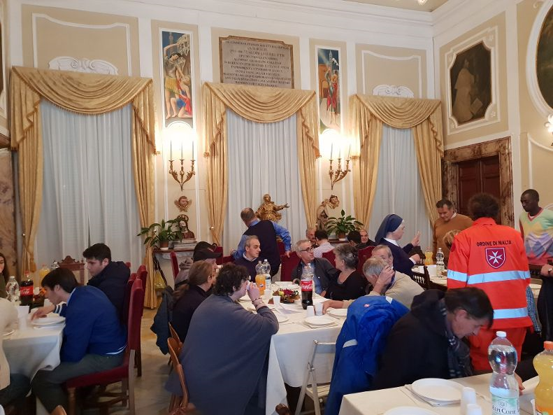 In Palazzo arcivescovile sembra che questo sia accaduto: tantissimi giovani, volontari, pronti ad accogliere, a sorridere, a distribuire il pasto offerto dalle Contrade, felici di una giornata semplice e particolare da trascorrere con tanti ospiti in amicizia fraterna.