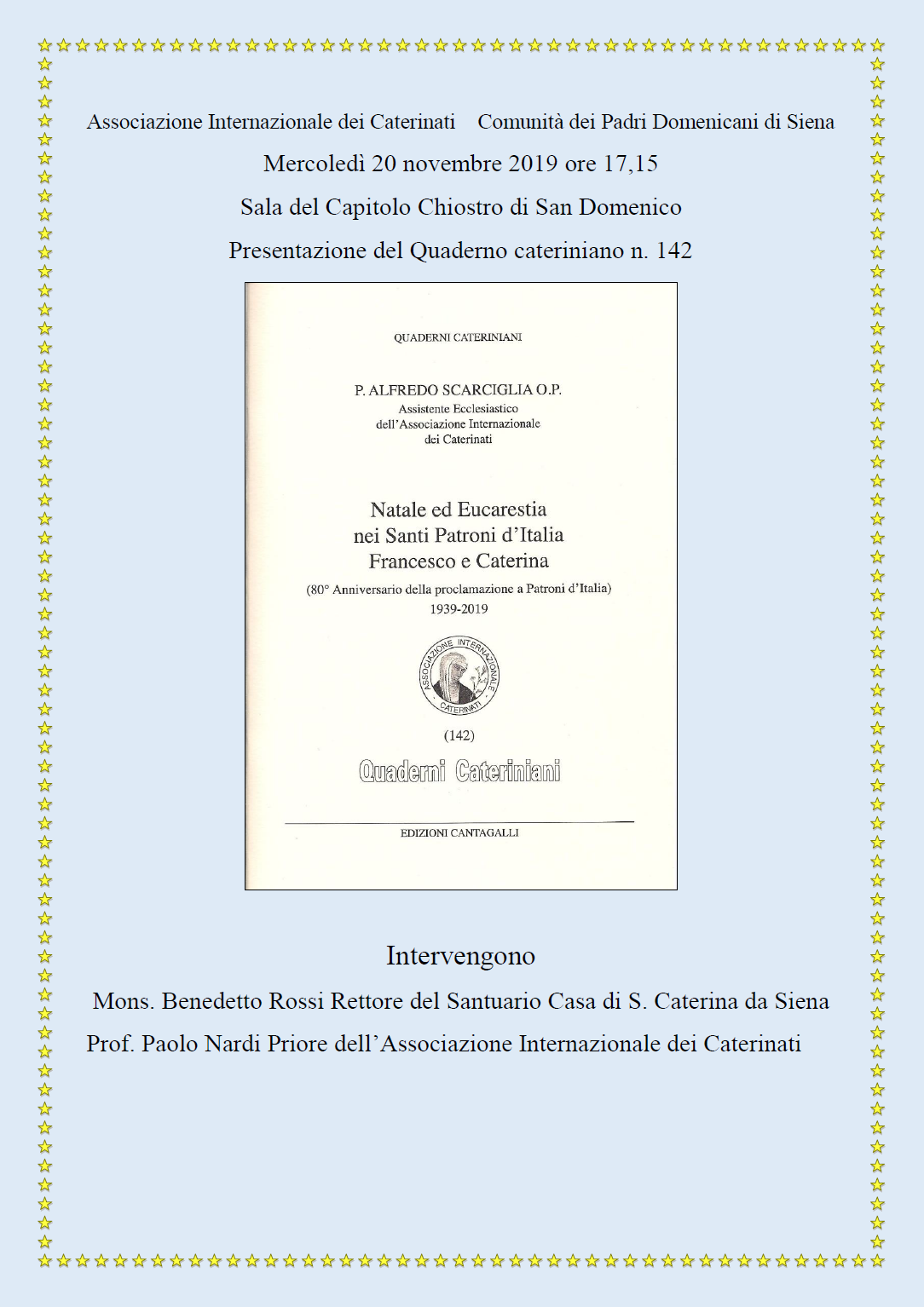 NEWS 11 Novembre 2019 Mercoledì 20 novembre 2019 presentazione del Quaderno cateriniano: “Natale ed Eucarestia nei Santi Patroni Francesco e Caterina” nell’80esimo anniversario della proclamazione a Patroni d’Italia.